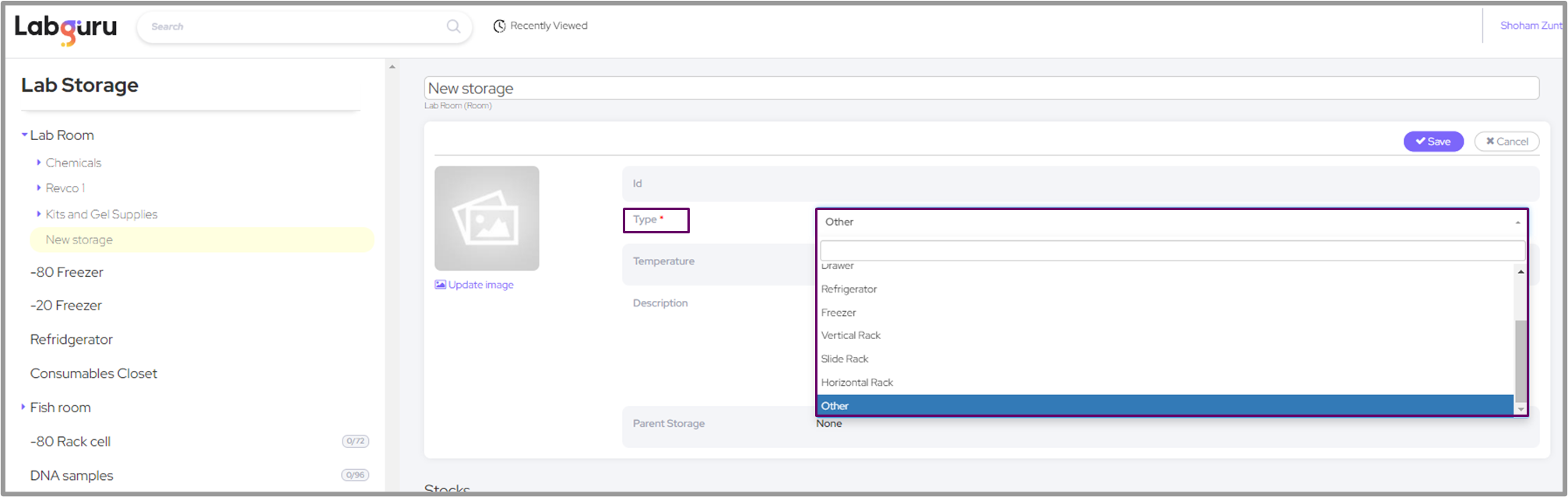 When creating storages in Labguru, there is an option to set a type, the types are: Room, Shelf, Closet, Drawer, Refrigerator, Freezer, Rack, Slide rack, and Other.
