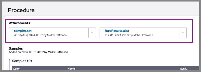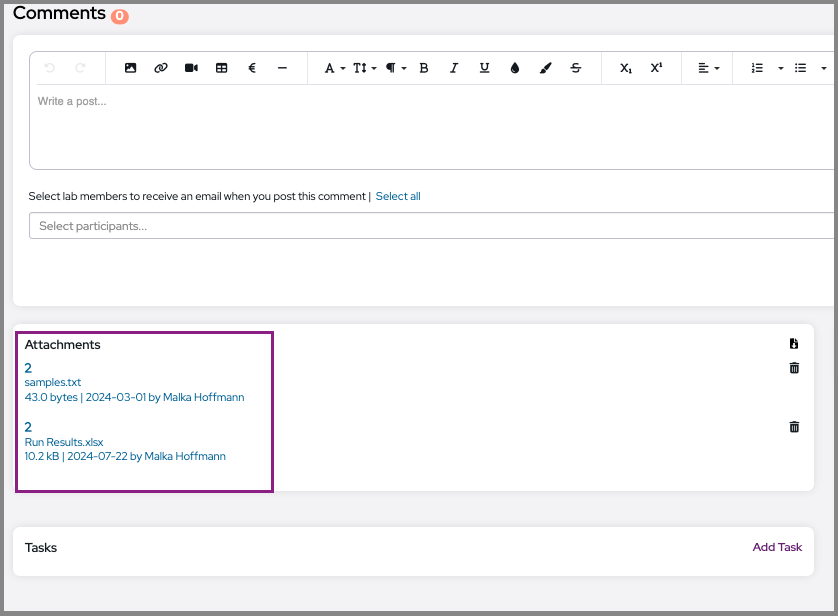 When using the POST attachment API endpoint to upload a file to an experiment, the uploaded file will appear, by default, in the attachment box at the bottom of the experiment’s page: