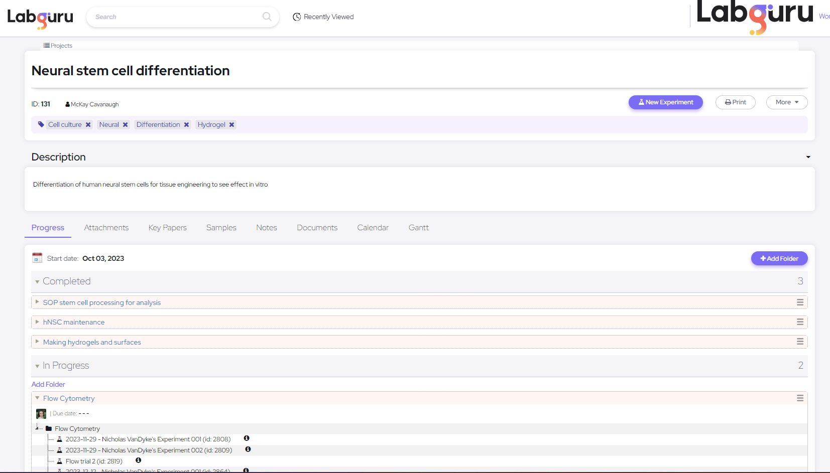 - Progress: This tab shows all the folder structure and experiments within, it allows you to move folders to various states to show if folders were completed and those that are still in progress. It also allows to move of individual experiments by dragging and dropping.