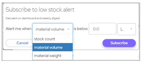 1. Choose the minimal threshold to turn on the alert. You can designate the measurement type for the alert, it includes the following types: stock count, material volume, or material weight, and click on "Save".