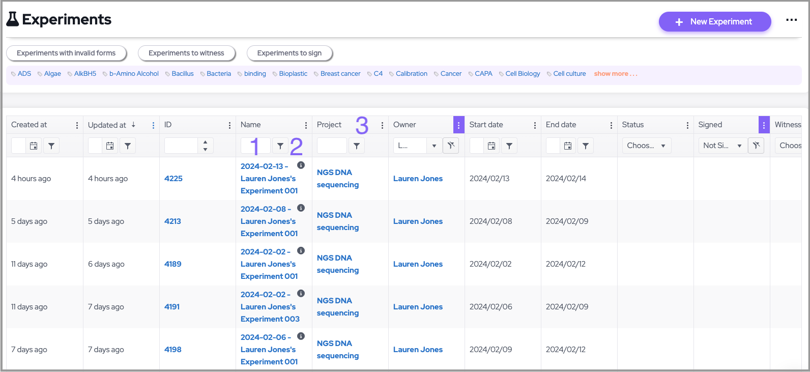 The Global Search, located on the top right of every Labguru page, is the most complete and powerful search tool of the app. All the data in the account can be found with it, including experiment names and content. Even text within attachments (PDF or any attachment with text) that were added to a page.