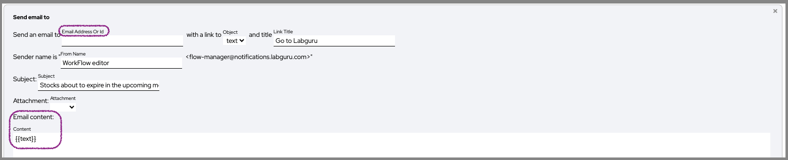 After defining the text variable and the information that should be sent to the user, we've added the ‘Send email to’ step for setting up the email notification.