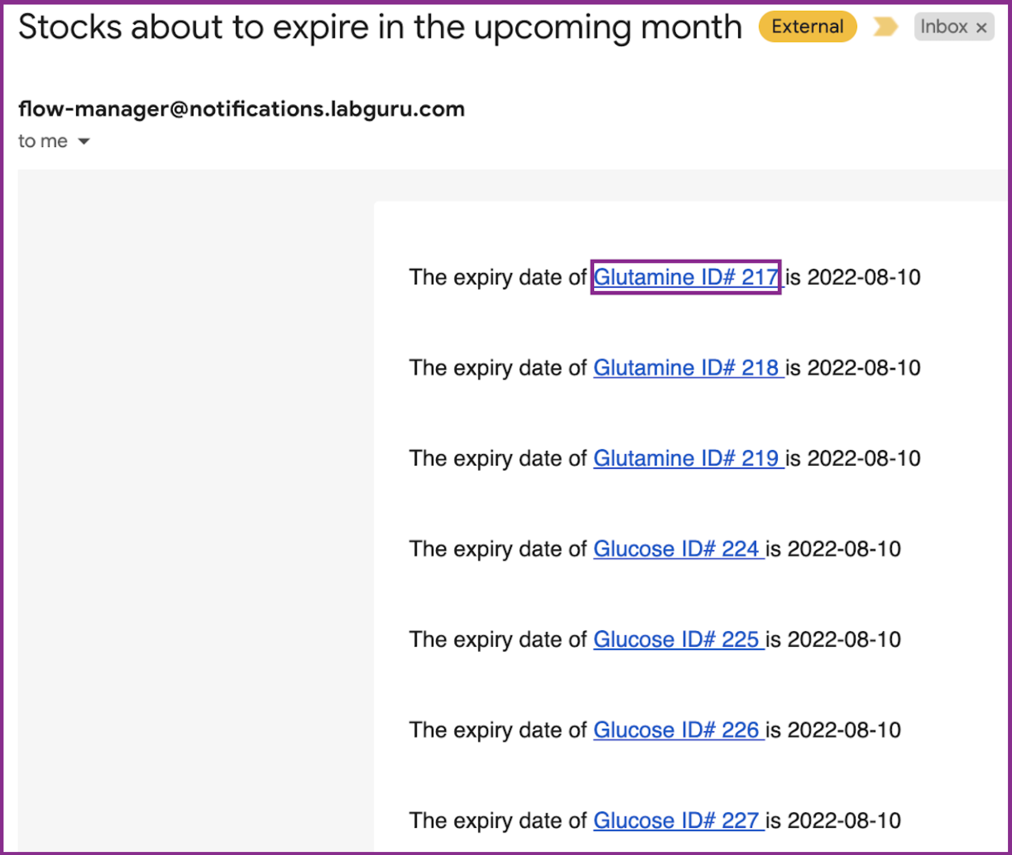 Below we present a use case of a commonly requested automation for tracking stocks' expiry dates in advance. This automation will help you prevent inadvertent use of expired stocks which might have an effect on the reliability of your research results.