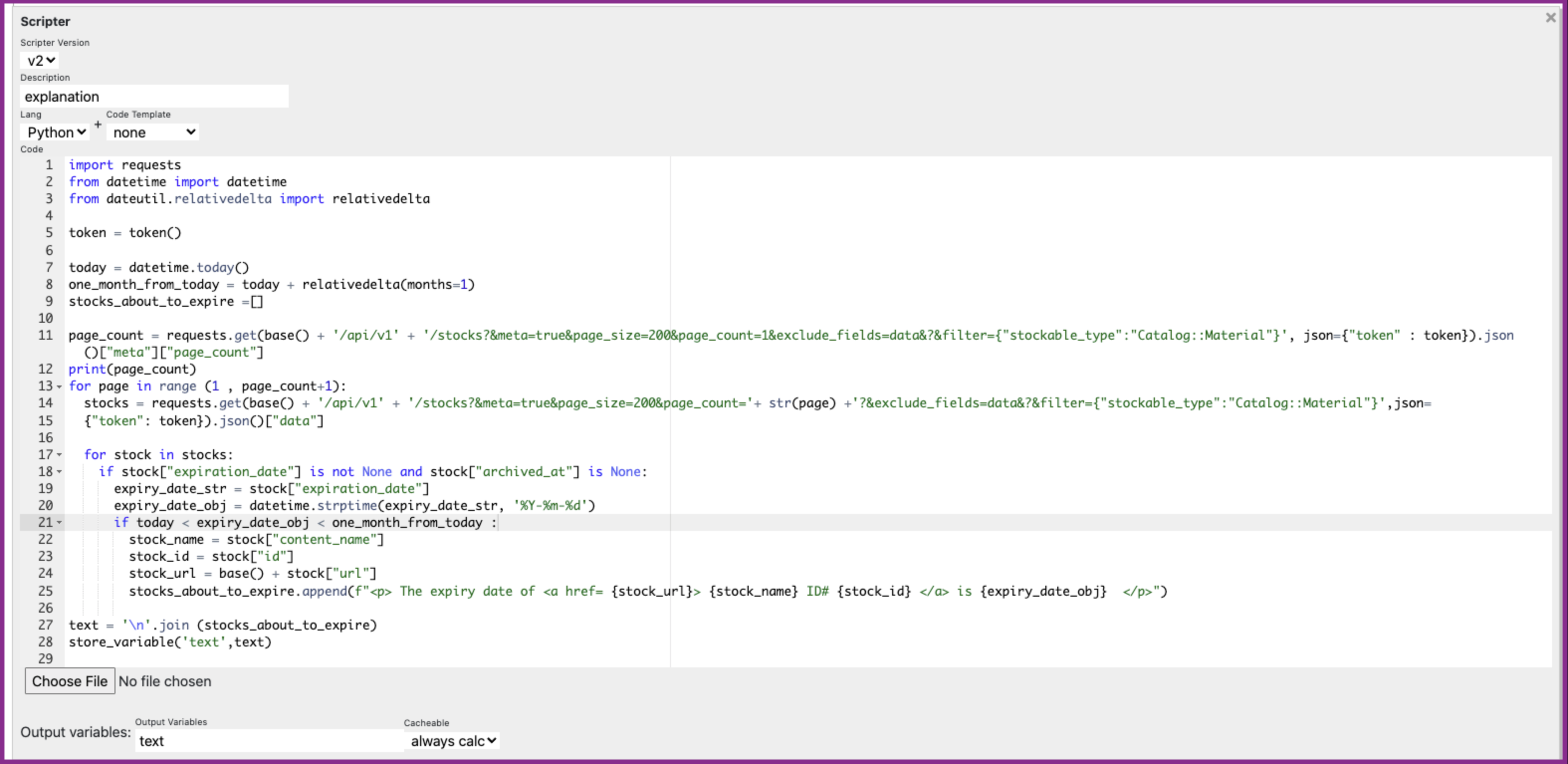 The next step after setting up the trigger includes a scripter with a python script that searches for all stocks from the consumables collection that are about to expire in the upcoming month: