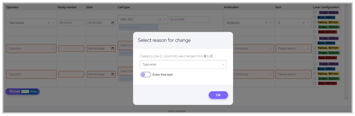 Labguru provides users with a convenient and real-time documentation tool for specifying the reasons for changes. These documented reasons are seamlessly reflected in the audit trail, bolstering transparency and accountability.