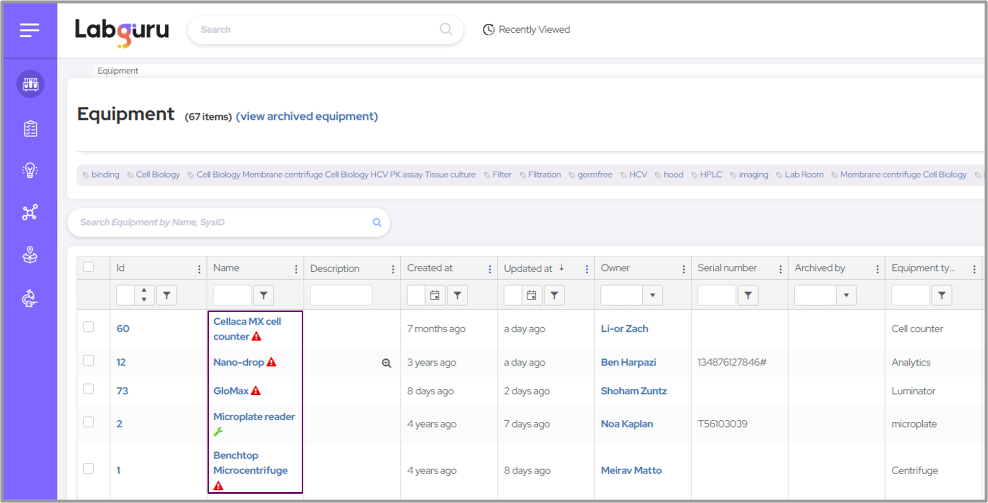 Maintenance and calibration of equipment are crucial for generating accurate, GxP oriented results. Labguru allows you to keep track of maintenance and calibration events so you will never have to worry about inadvertent use of uncalibrated or unmaintained instruments. Maintenance notifications appear in your dashboard and next to instruments on the equipment index page.