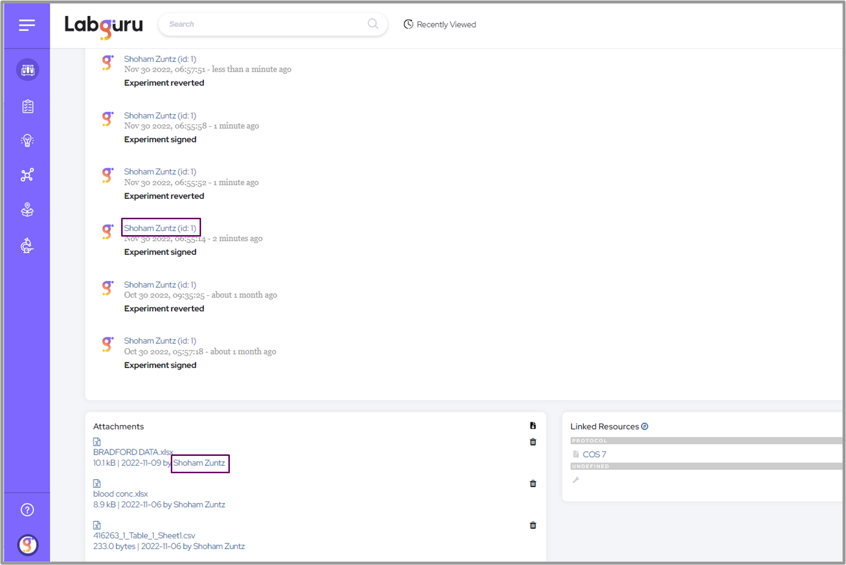 GxP guidelines state that all data generated or collected must be attributable to the person generating the data. Labguru captures every action executed by the user such as marking experiment steps as completed, adding attachments, signing protocols/experiments, and more, so that each activity can be attributable to the person who performed it.