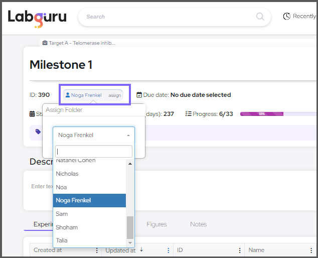 Assign Labguru pages such as projects, folders or experiments created by you to any of your Labguru members