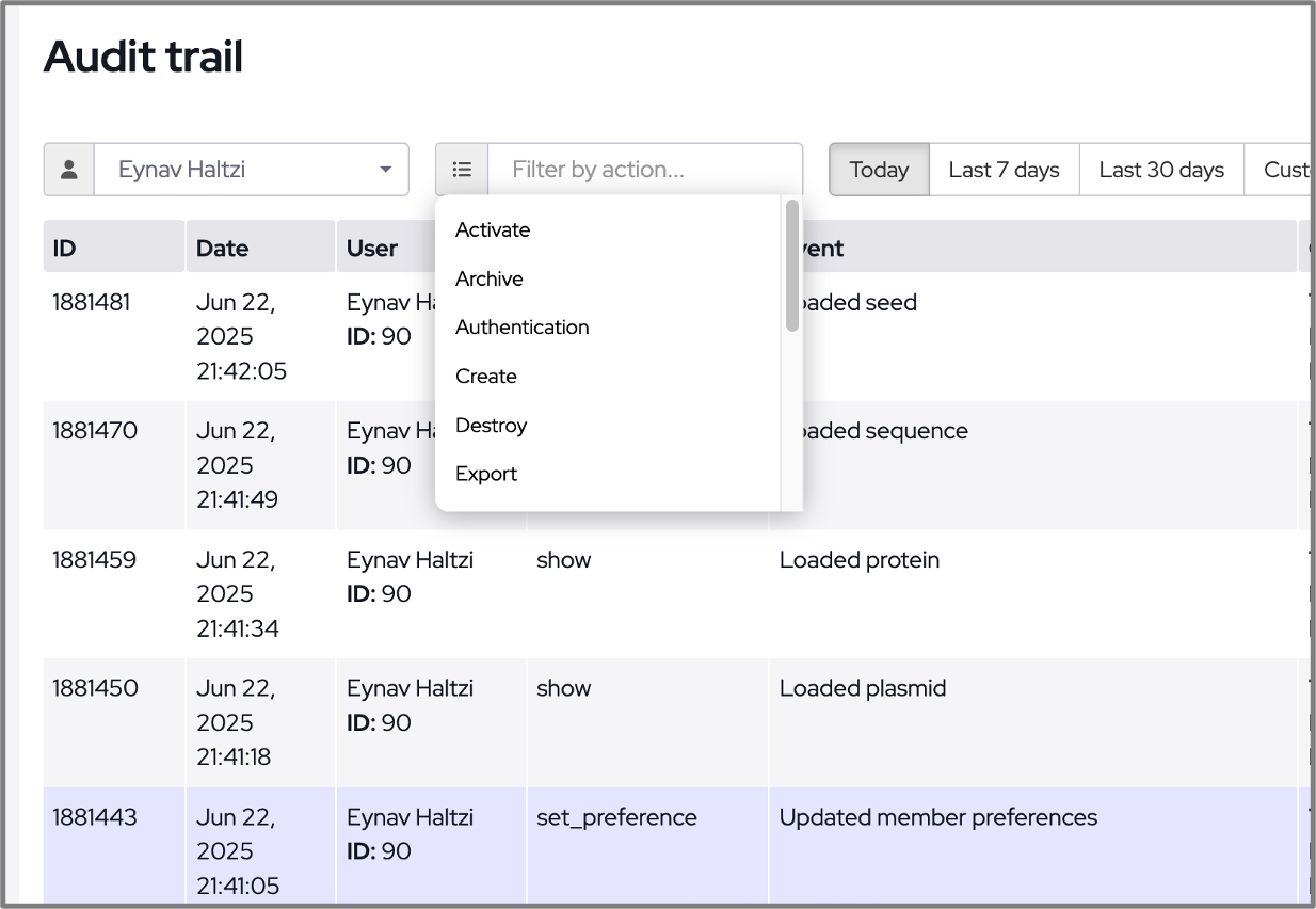 New action-based filter options have been added to the Audit Trail, allowing users to filter results by specific actions including 'Created', 'Updated', 'Archived', and 'Destroyed'.