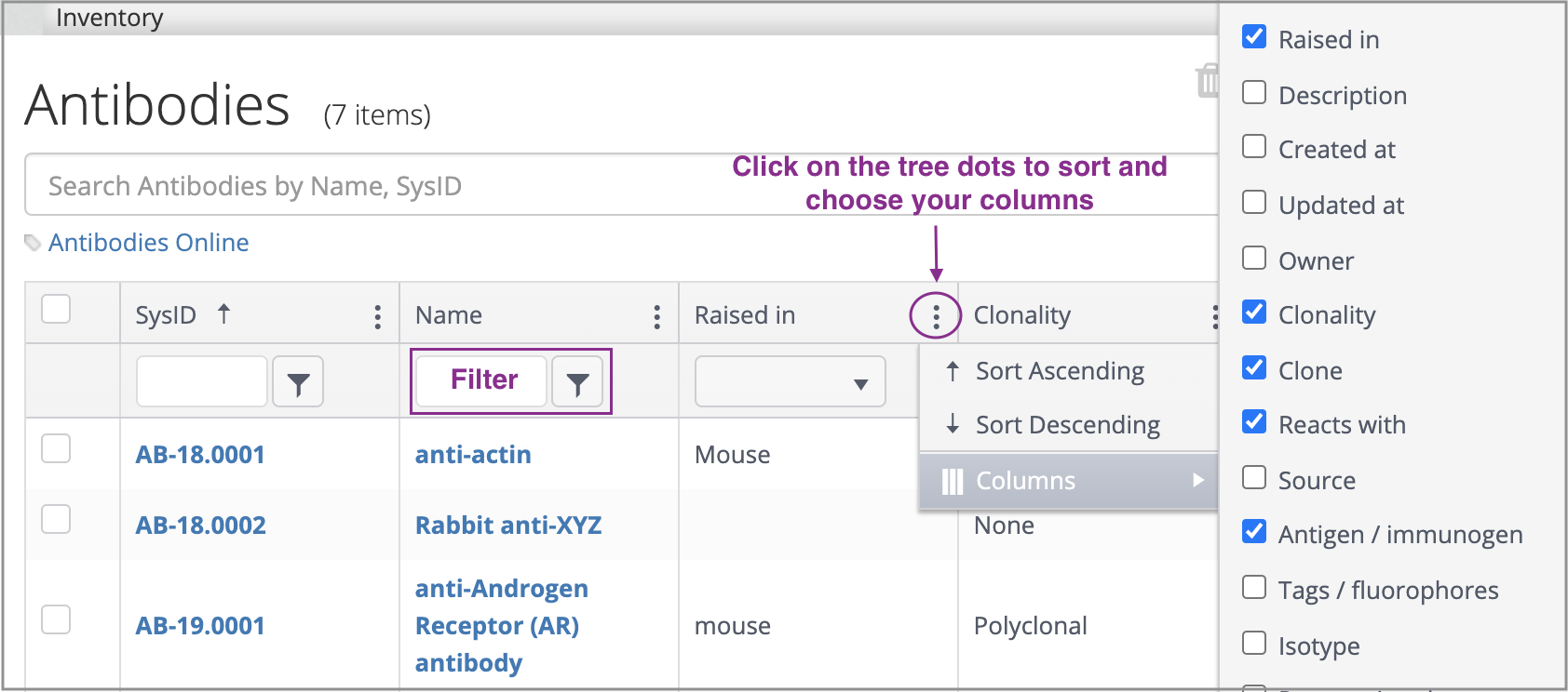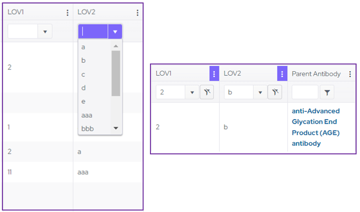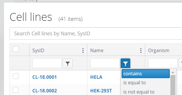 Columns created from field type of "List of values" throughout Labguru pages were added a filter by search option at column headers