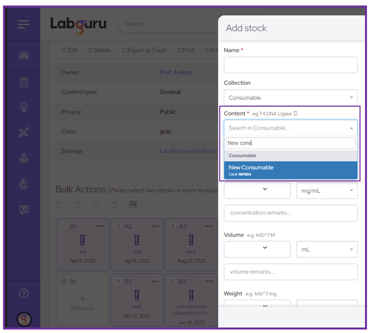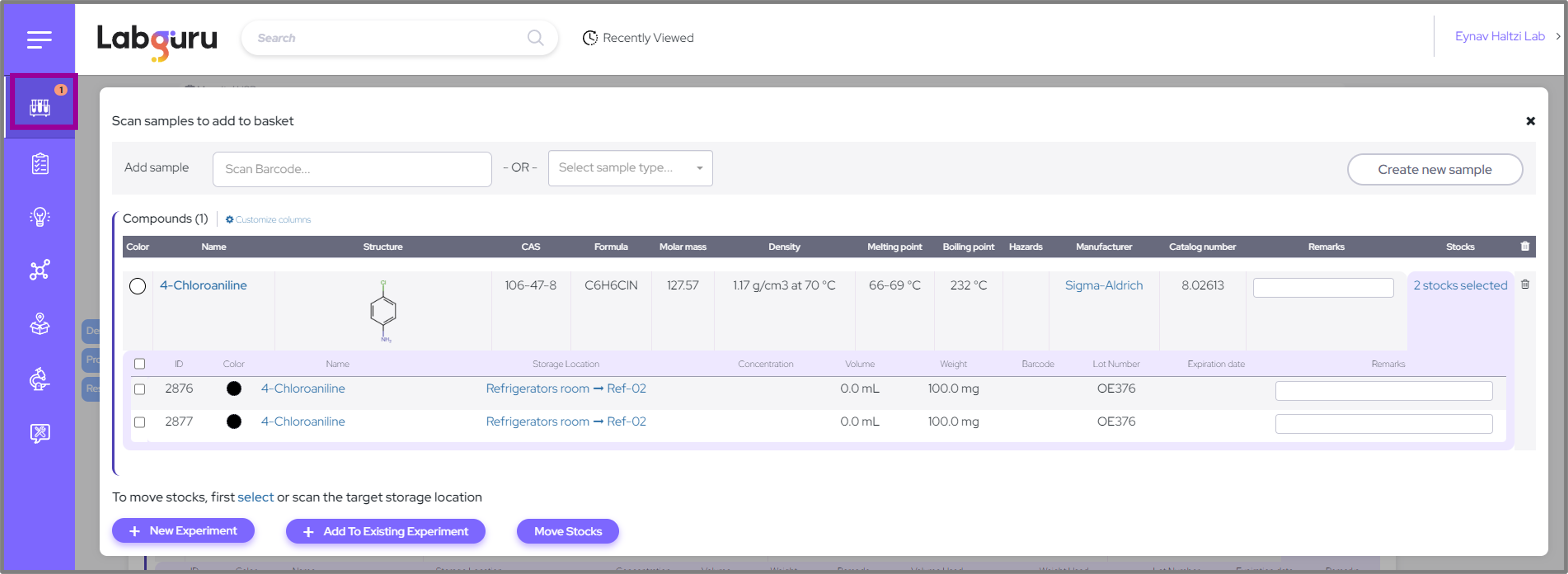 Connect Labguru to Avantor IM to sync storage locations, view materials, and access PoU details like stock levels and quantity thresholds, with real-time updates as stocks are consumed.