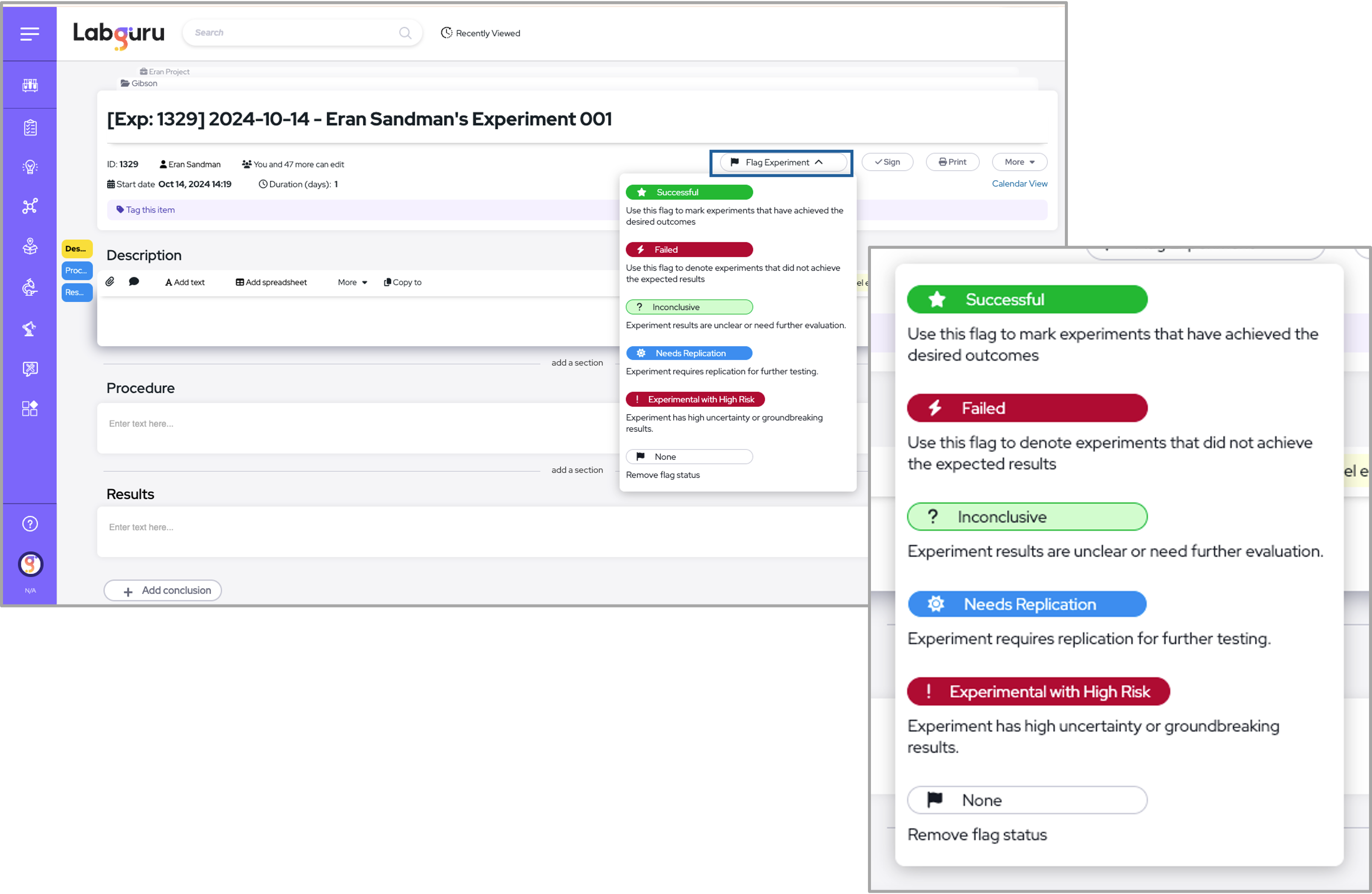 Introducing experiment flagging in Labguru! Easily categorize experiments with custom flags, enabling quick sorting and filtering based on outcomes. Admins can add icons, colors, and descriptions to tailor flags for the organization’s needs.