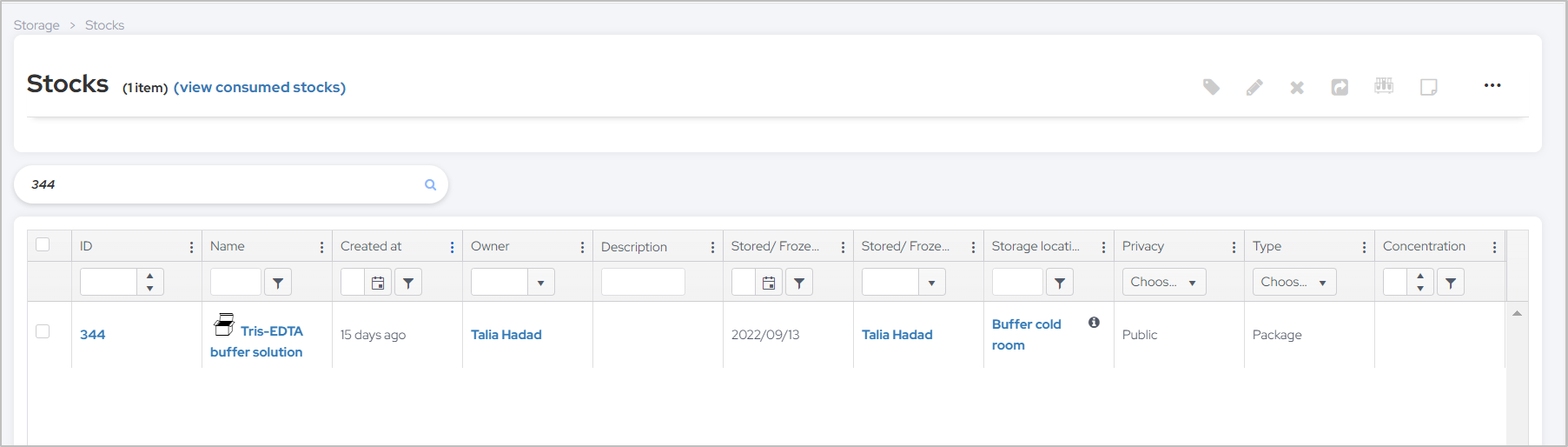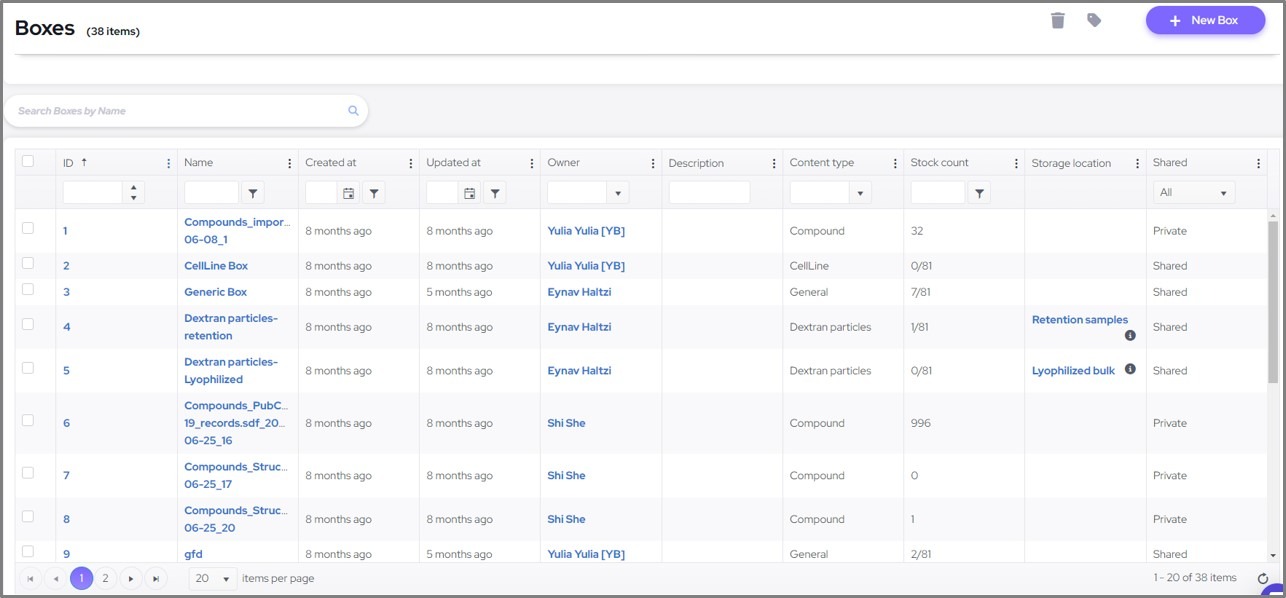 The boxes index page can now be filtered by different box fields like Box ID, Box name, Content type, and even Stock count, which enhances the efficiency of Labguru inventory management.