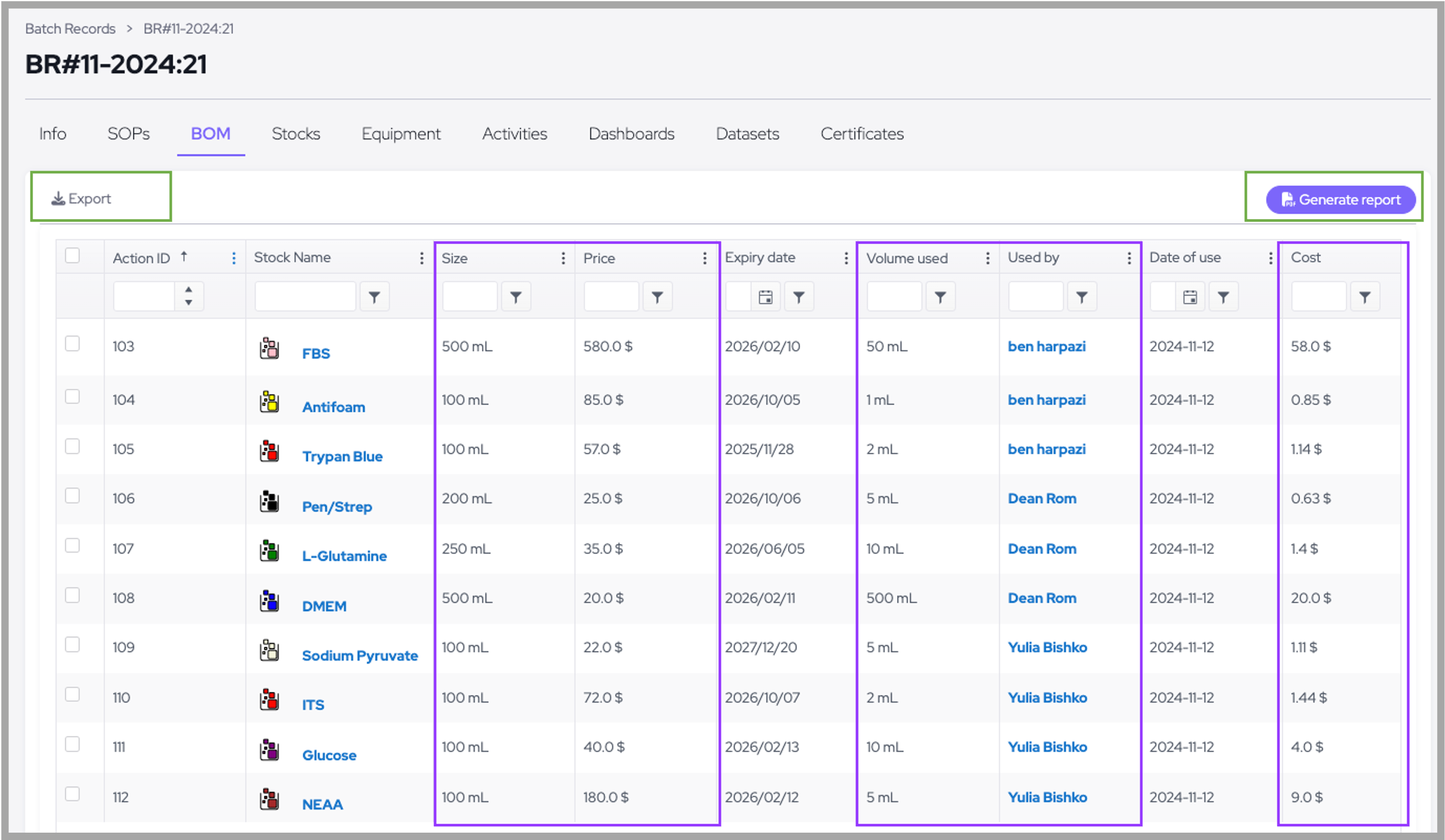 The eBR module now allows you to seamlessly document and organize all materials used throughout batch production with Labguru's Bill of Materials (BOM). It automatically records usage events in a structured table, providing a clear view of material consumption, quantities used, and costs. This transparency supports accurate cost tracking and budget management.
