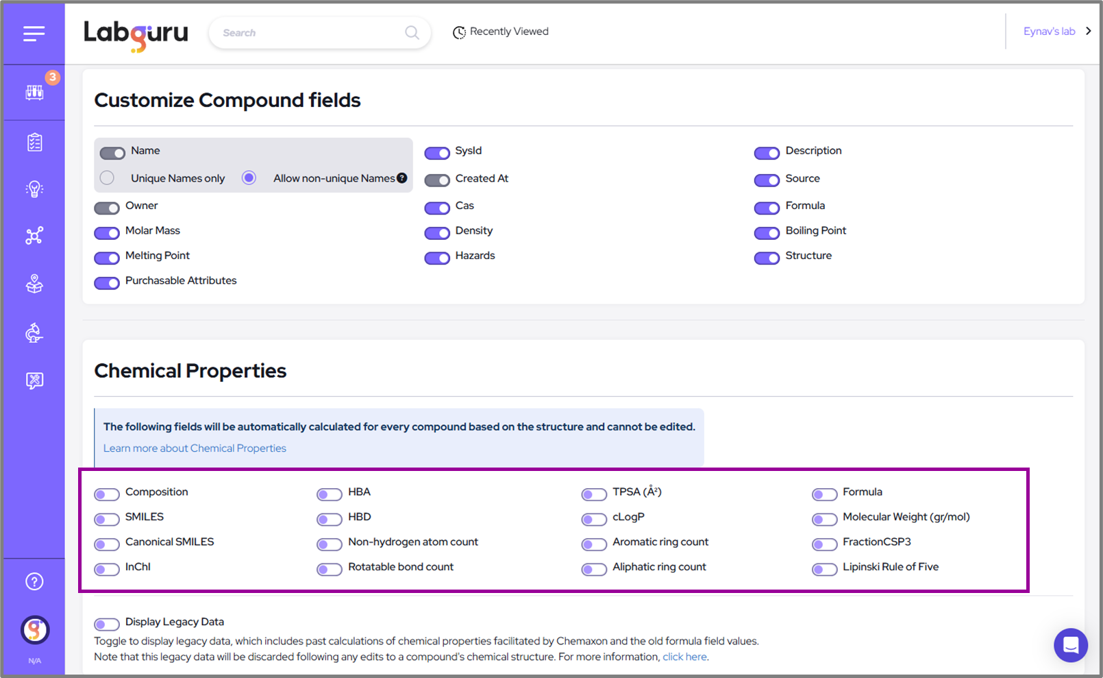 Labguru’s Chemical Compounds module now uses OpenBabel for auto-calculating chemical properties, replacing the Chemaxon integration, offering a wider variety of chemical properties to be automatically calculated for each compound in the collection.