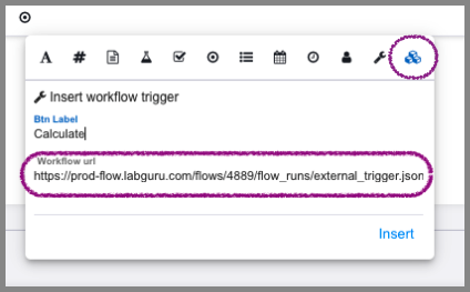 When creating a button, type the button name in the 'Btn label' field and paste the external URL (from step 1) in the 'Workflow URL' field: