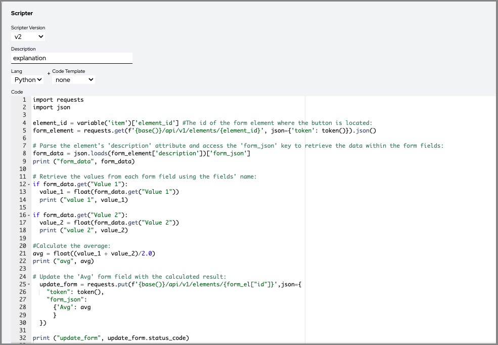print ("form_data", form_data)Then, the values within the Form fields can be retrieved easily and used in calculations (in this case, average):