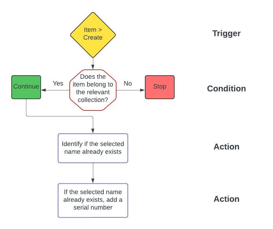 Below is an example of a flow chart for a naming convention flow of an inventory collection, where the automation should check if the selected name already exists, and if it does, add a number to the selected name: