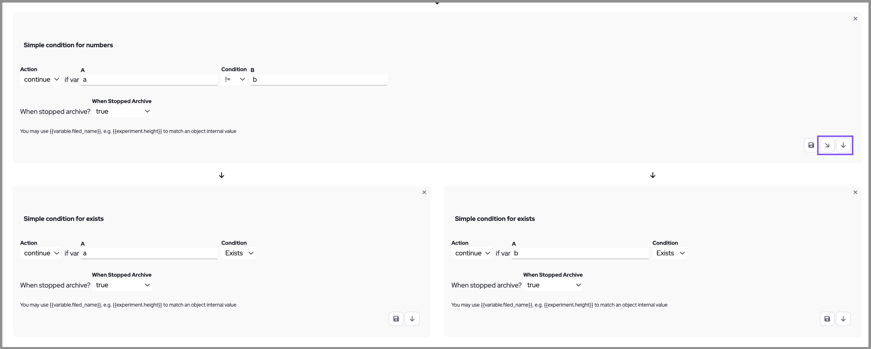 To create parallel scenarios to execute according to different conditions, use the branching option: click on the diagonal arrow icon to add another condition step.
