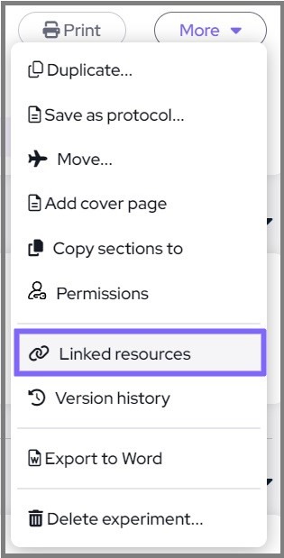 To add a link, click on the "add link" button in the Linked Resources box, or on "Linked Resources" option found under the experiment "More" menu.