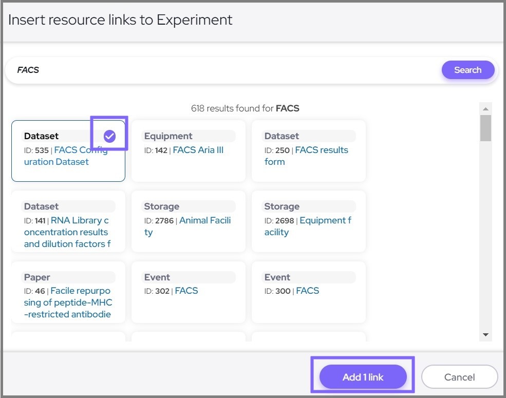 After searching for the relevant item(s), click on it to select, and choose "Add 1 link" to link it to your experiment.