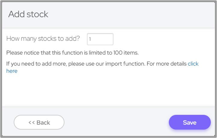 * Once you saved the ״add stock” form, a popup window will appear with the option to choose the number of stocks you want to add.