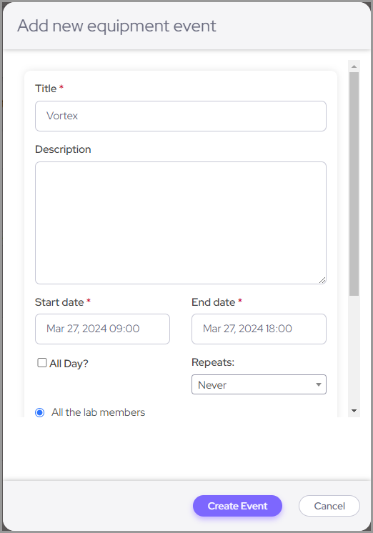 To book a time slot (hourly or daily) just click on the desired time (a day or an hour) or by creating a new event. Time slots booked by you and others will also appear in you own Labguru calendar (you need to make it visible by choosing so in the 'Views' option in the general calendar). Events can be also created from the equipment element within experiments.