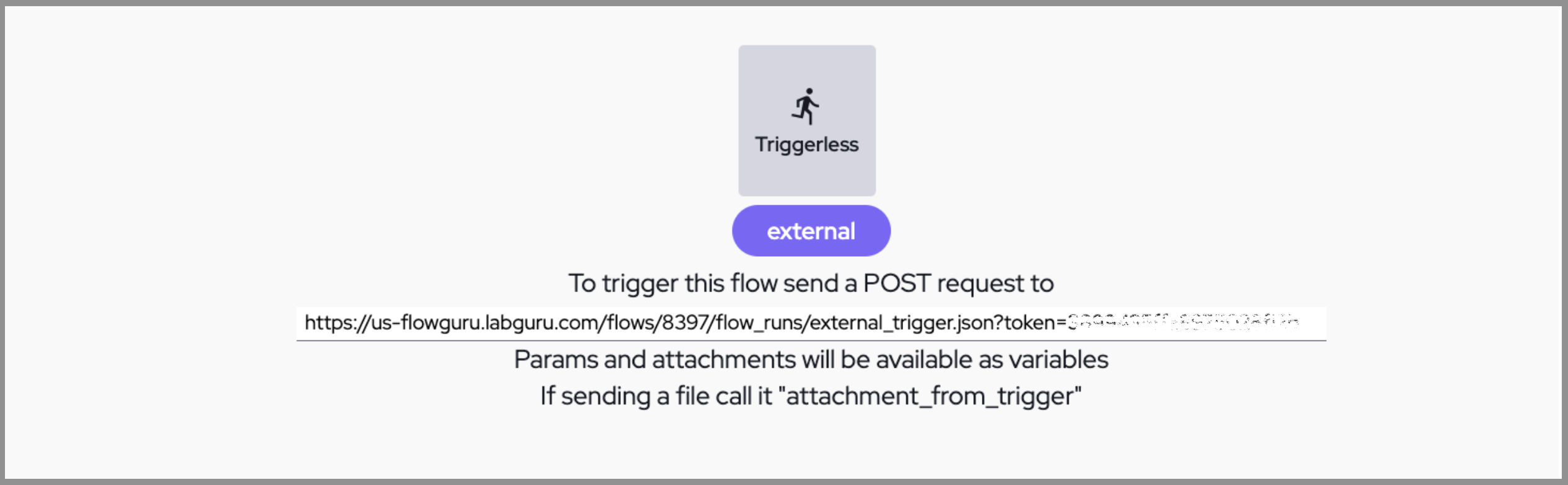 External - Trigger by creating a POST request to a specific API endpoint. You can send parameters/files and they will be available as variables. To access the parameter you sent, add a scripter step and add this variable
