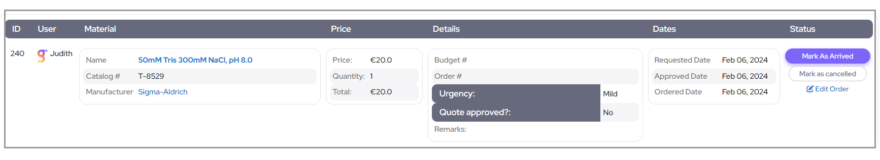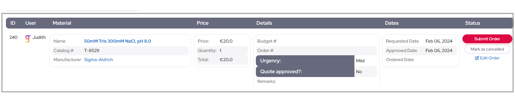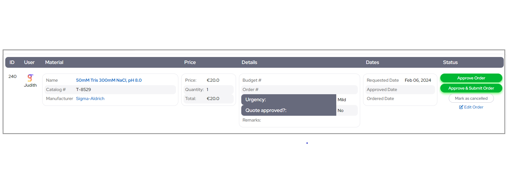 After an item is added, users with the "Can approve orders" permission are notified to approve the order. This step ensures that only authorized individuals review and approve procurement requests.