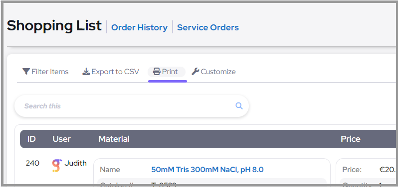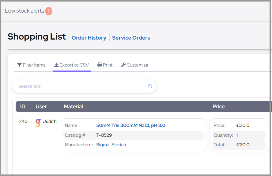 In addition to printing purchase orders, Labguru also allows you to export your entire shopping list or order history in CSV format. This can be useful for creating reports or analyzing your lab's purchasing trends.