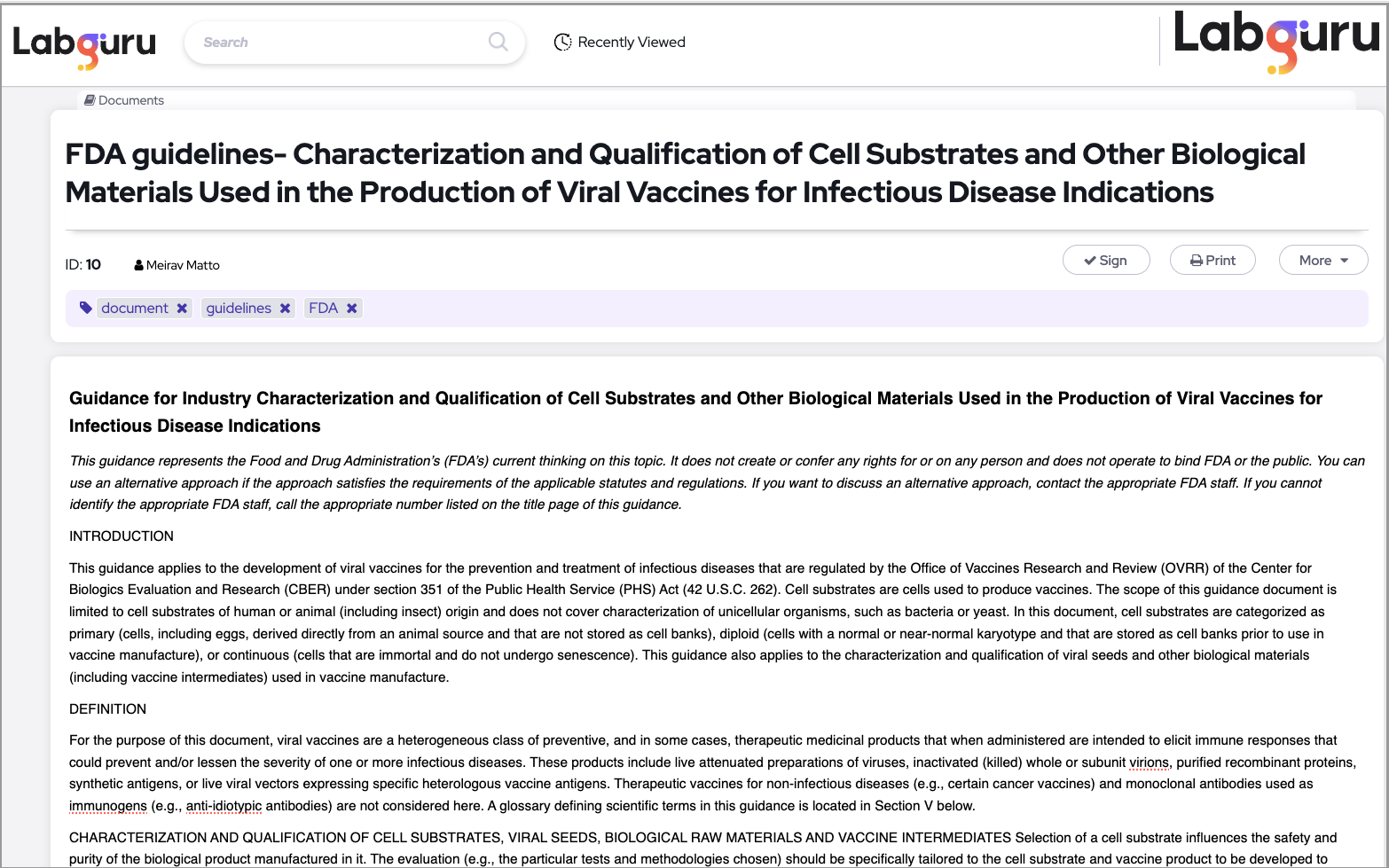 The documents page works just like experiments: you can attach files, add inline images and tables. You can link the page to any other page in Labguru and of course, you can duplicate or print it.