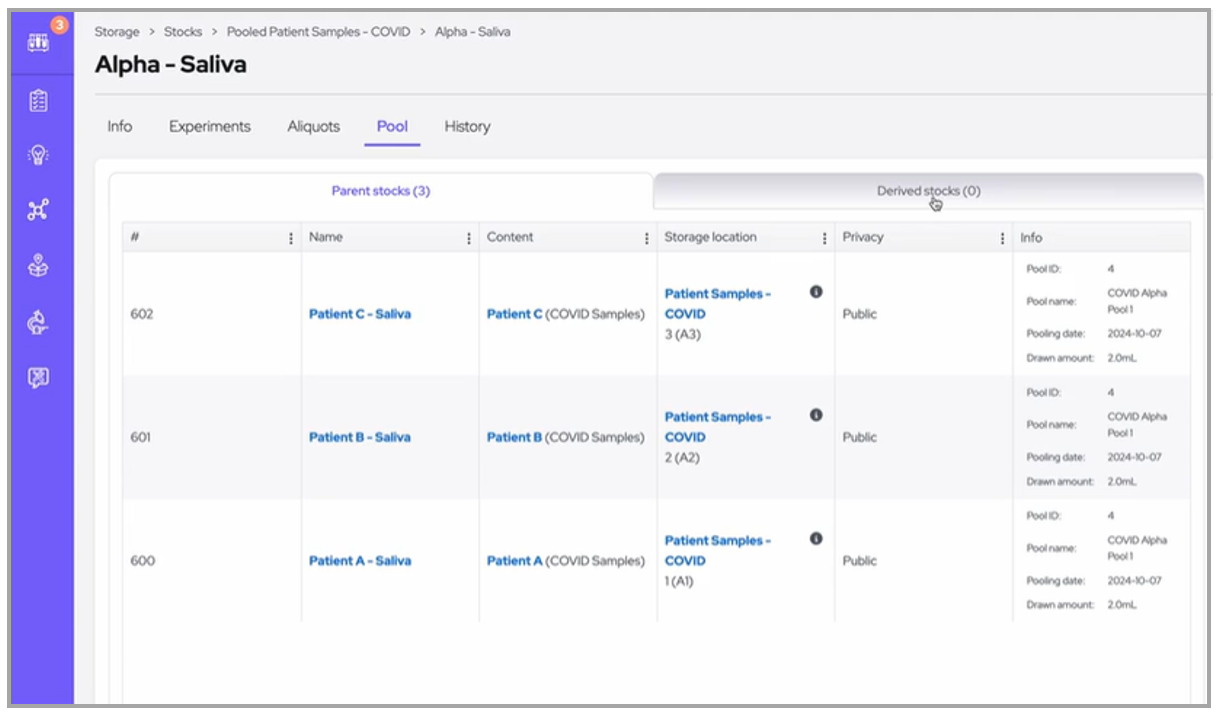 The 'Pool' tab serves as a central hub, providing complete traceability for each sample included in the pool, as well as any pools derived from the current stock.