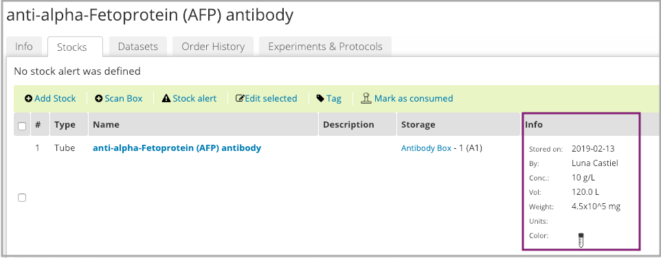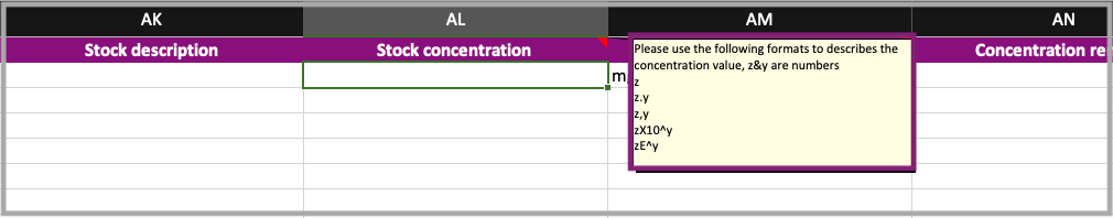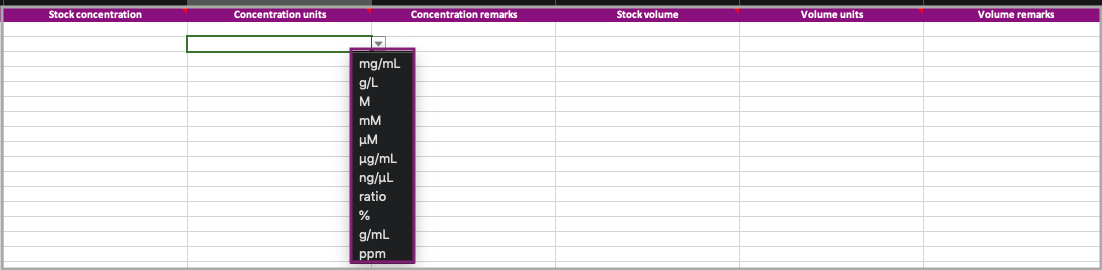 When adding a new stock or editing an existing one, you can add a value to any of the quantity fields (concentration, volume, weight), add exponent if relevant.