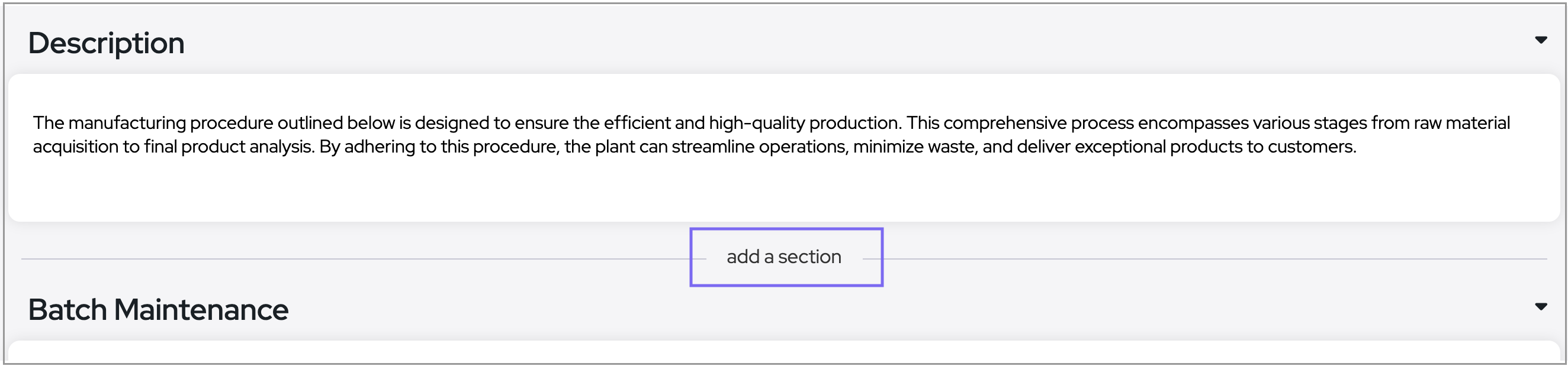 1.1 - Create Custom sections by clicking on "Add section". The new custom section has all the editing options as the procedure section (adding images, links, dates, steps...).