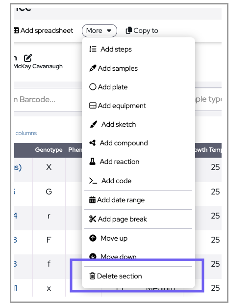 4. Deleting sections - You can delete all the sections in an experiment or protocol except Results, simply click on "more" drop-down menu and choose to delete section.