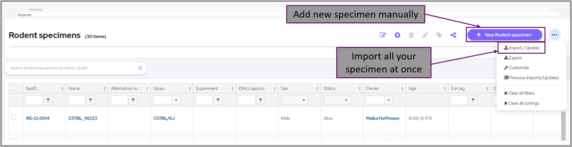 1. Manually: As in other collections, you can add new rodents strains and specimens one by one by clicking on 'New rodent strain'/'New rodent specimen' in the index pages. This will open up a page in which you can enter all the information you wish to record.