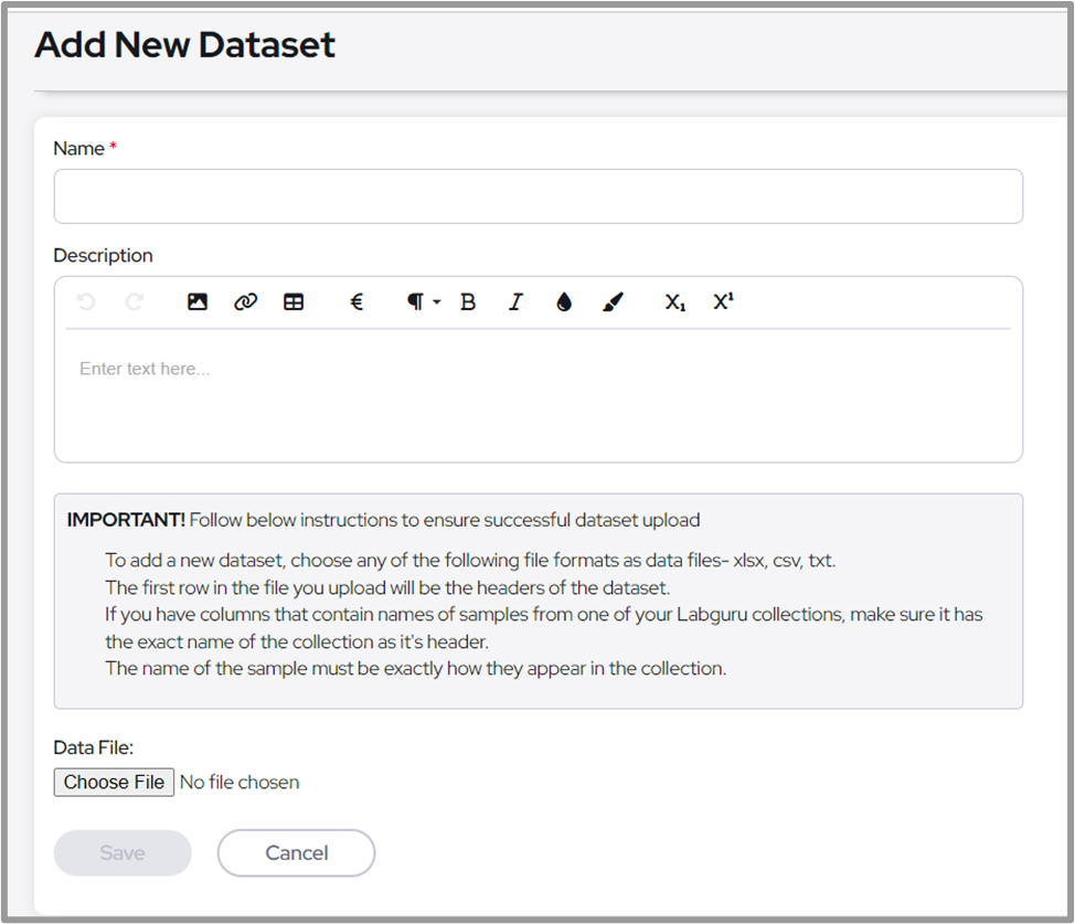 A dataset, in Labguru, is a set of experimental results or any set of numerical/textual data in a table format.