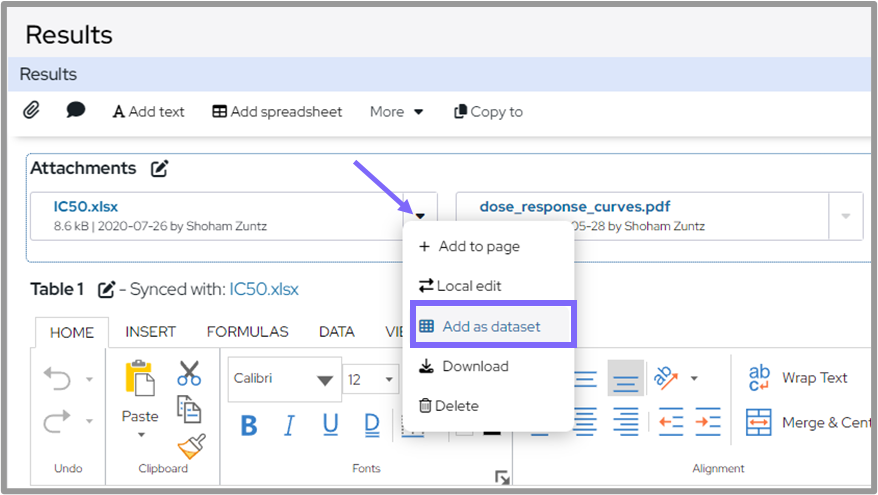You can turn any data files (Excel, .csv or .txt files) into a dataset after you attach it to your experiment. It will not affect the attachment, but will create a new dataset in the account. Once the creation of the dataset is completed you will get an email notification. If you want to change the name of the dataset or add description you can click on 'Edit' in the dataset page.