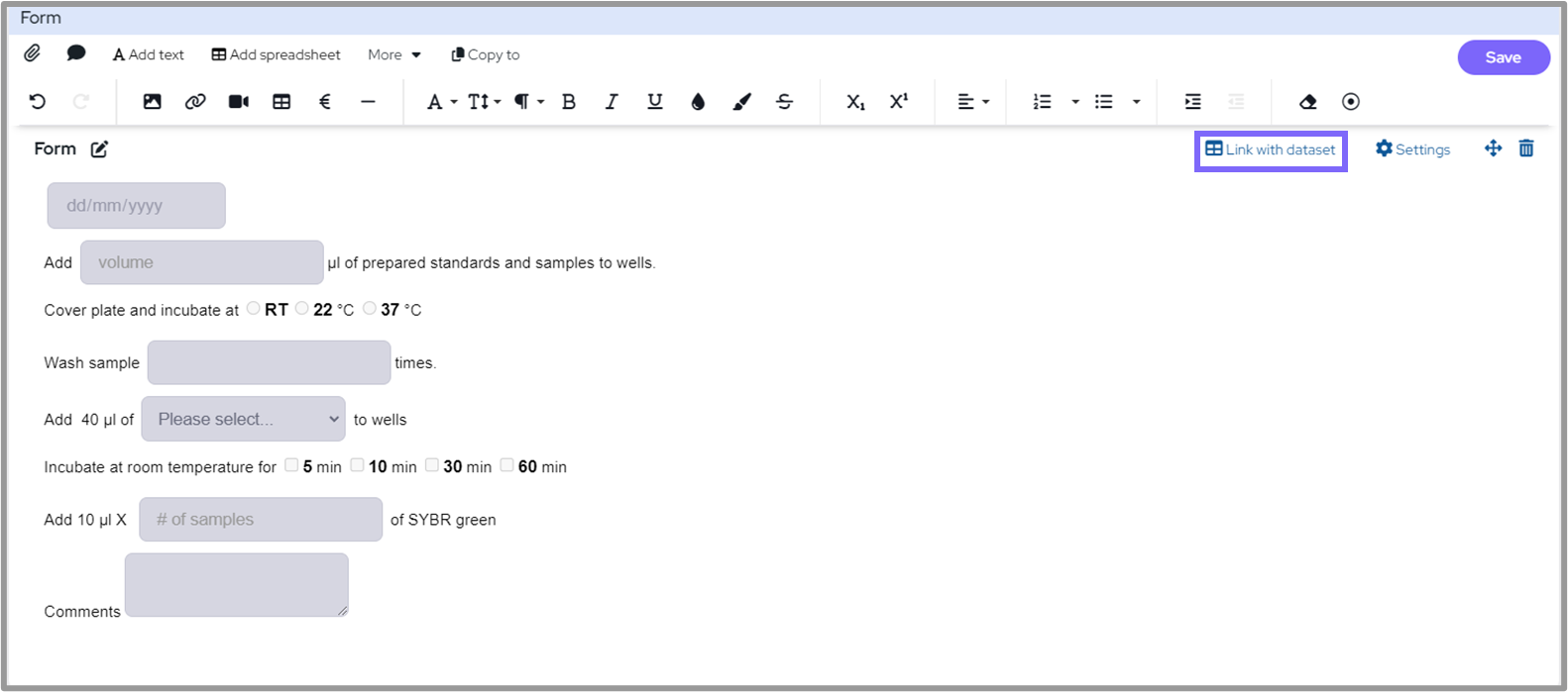 When creating a form element in a protocol, click on the 'Link with dataset' at the upper right corner in the form to link with a dataset: