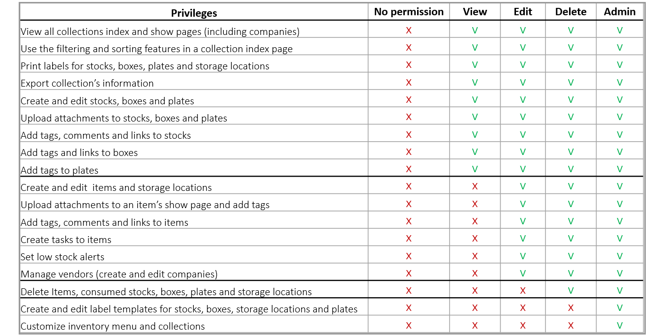 Members who perform day-to-day activities should have a more limited set of permissions. With ‘View’ permission in the inventory, storage, and equipment modules the user will be able to perform actions on stocks, plates, and boxes as well as add items to the shopping list, mark items as arrived, print labels, create events, performing maintenance events, exporting information and more.