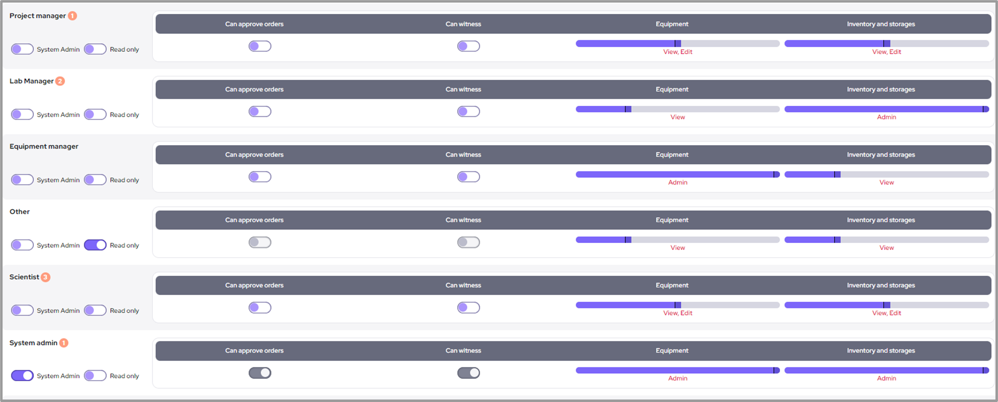 A member who oversees the laboratory activities should have permissions that will allow him access to create/edit entities such as items, equipment, and storage locations. These actions will be possible by granting the user with ‘Edit’ permission in the inventory, storage, and equipment modules. Another possibility is granting the user with ‘Delete’ permission, which will add the ability to delete entities.