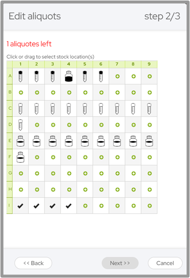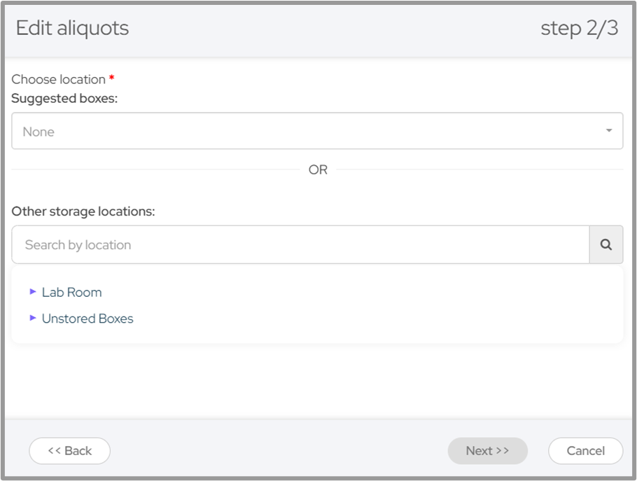 Next, you will be directed to select the location for the new aliquots. You can select a box or a storage location: