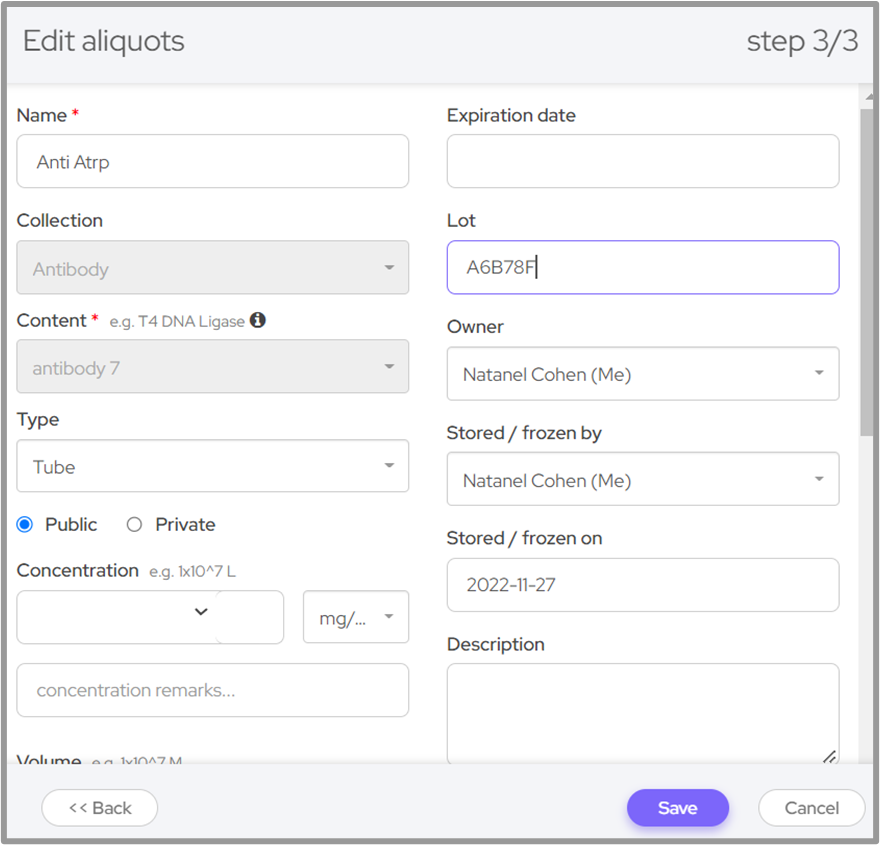In the last screen, you will be able to fill in more information for the newly created aliquots: