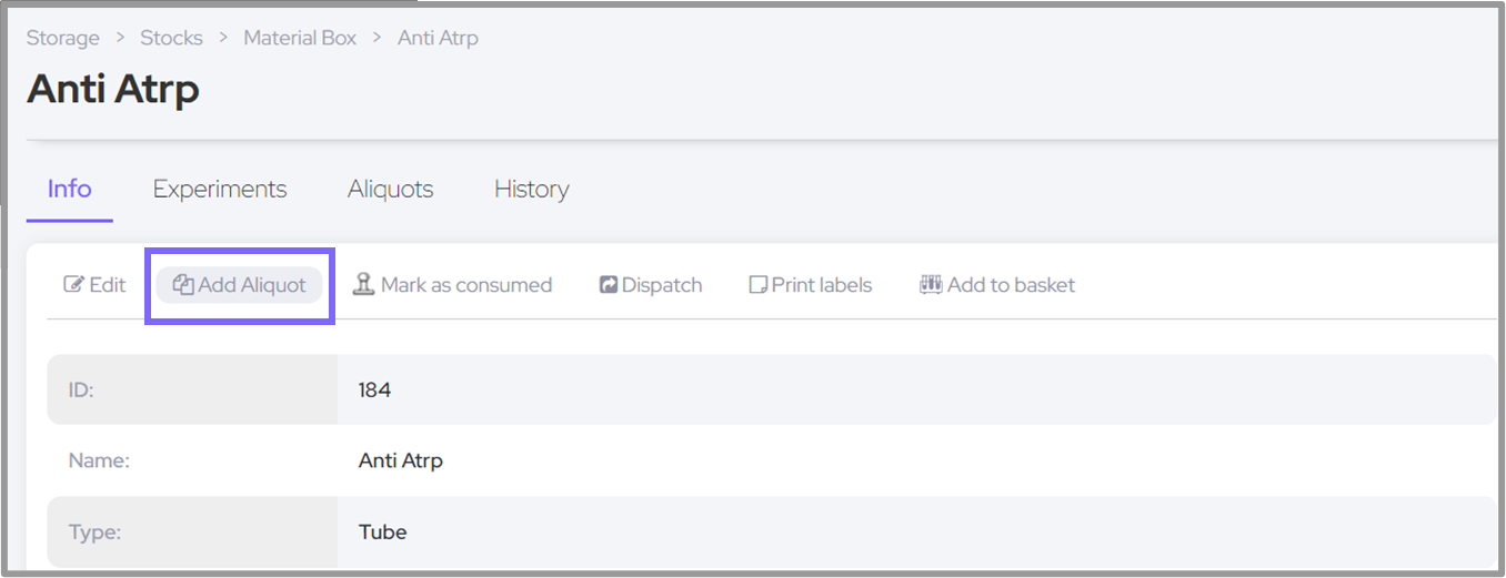 To start, go to the stock's page and click on "Add aliquot":