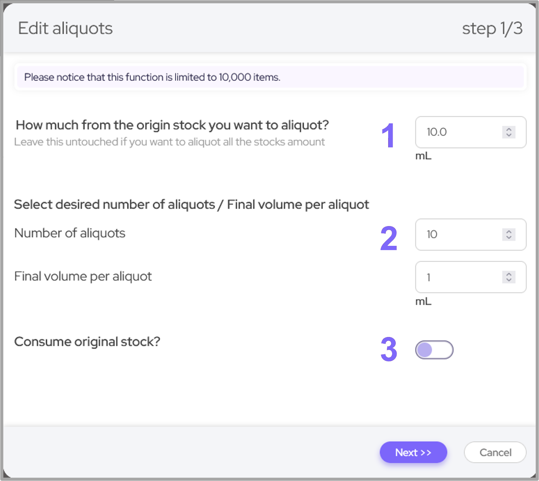 How much to aliquot - You can select the amount to aliquot from the original stock, the default is the whole stock amount. Note: You can also keep this field on zero to create volume-less aliqouts.