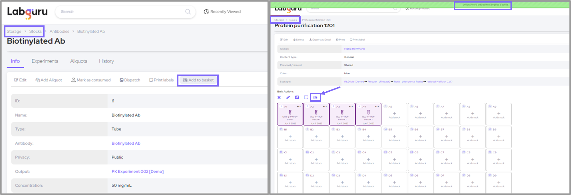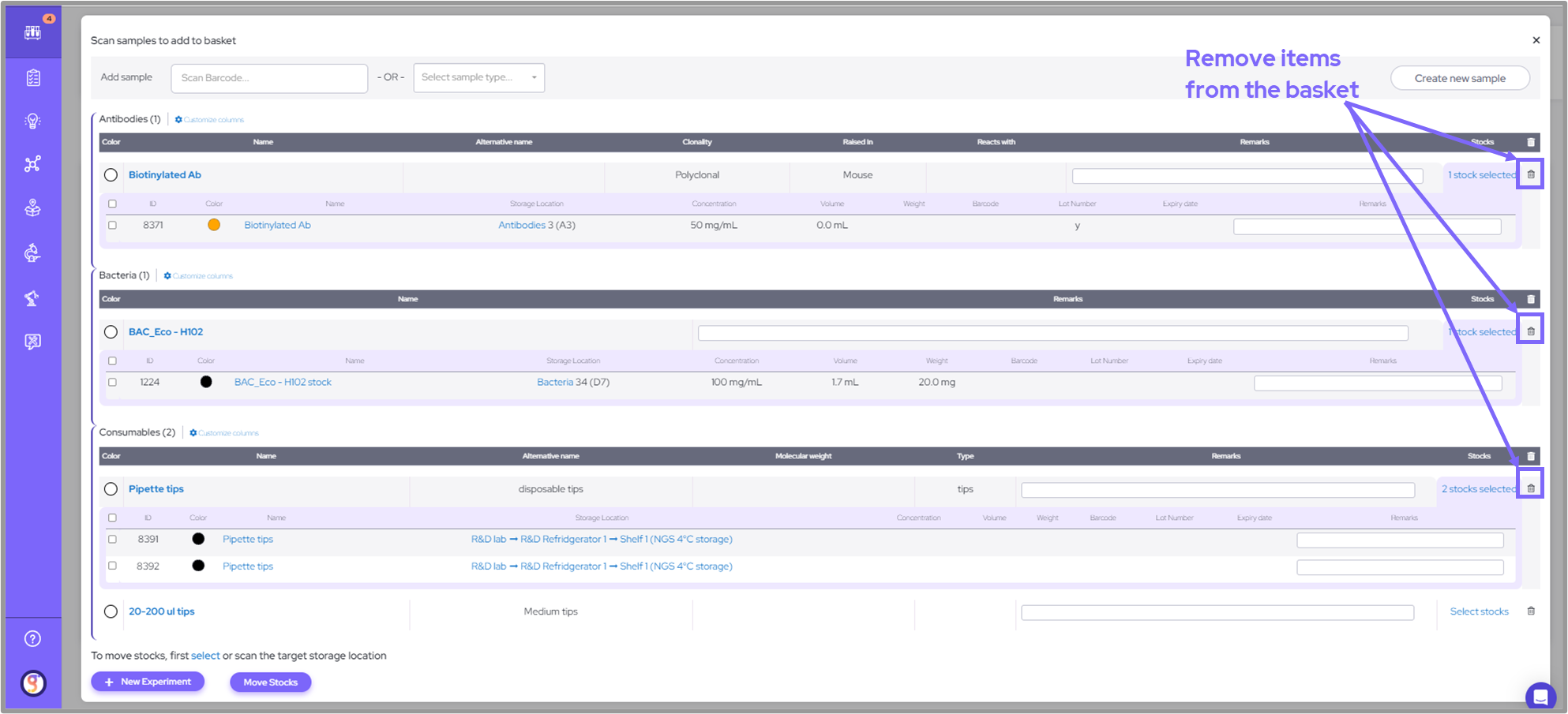 In this article, we will present how inventory items and stocks can be easily added to a new or an existing experiment by using the "Sample Basket" feature.