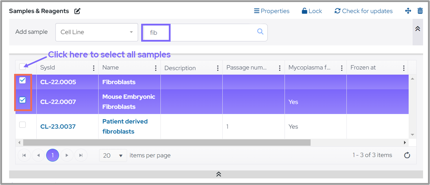 Select multiple samples using the "select all" checkbox to streamline the addition process.