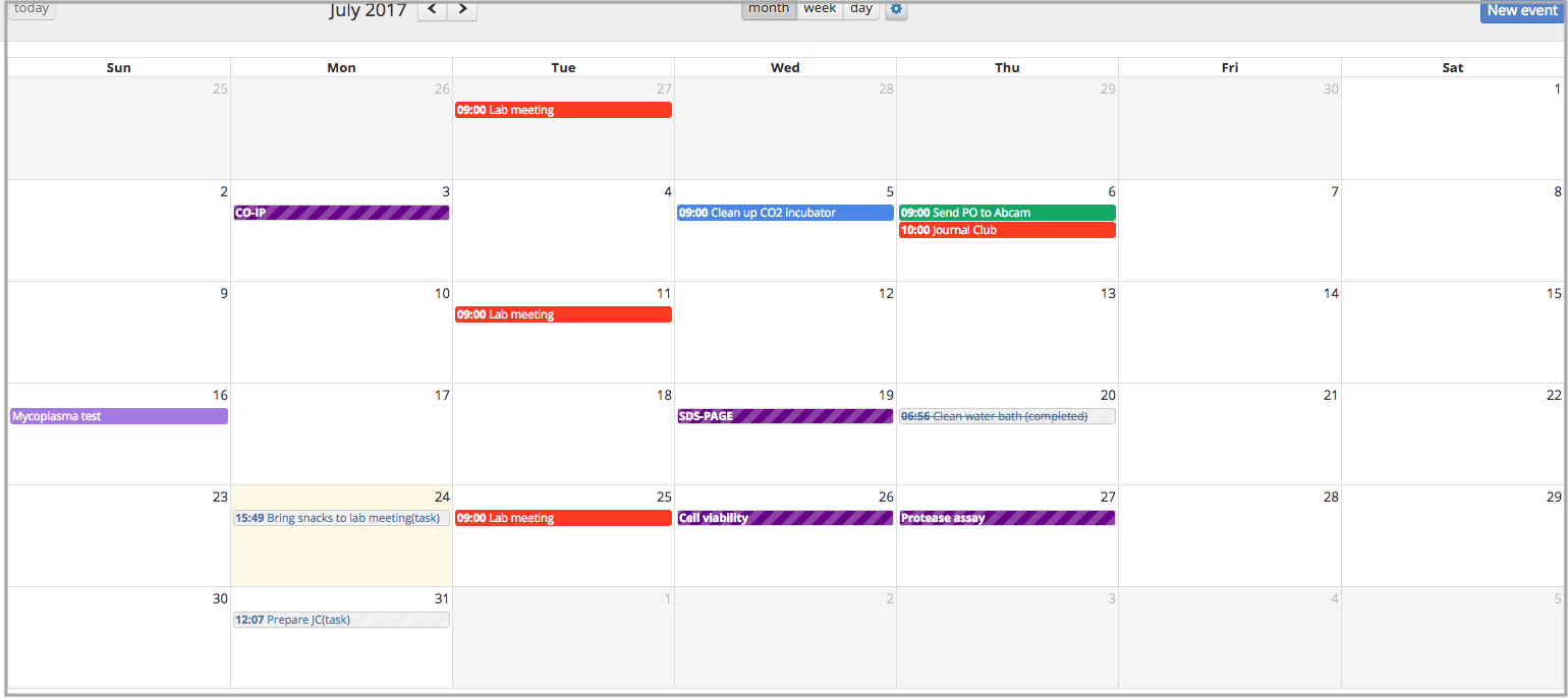 Decide which team member type of events you want to see in your Labguru calendar and choose different colours for each team member.