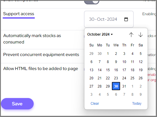Support access: by default the support access function of your account is off so you may be requested to turn this on. This can only be done by the account owner in the settings page - just choose the date* by which you're willing to give out support staff access to your account in the dropdown, and click Save.