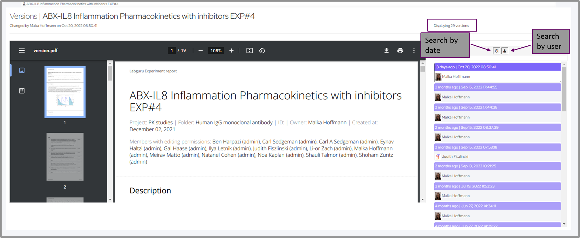 The previous versions, available in PDF format, appear in a list ordered by date with the option to sort versions by team members or by date: